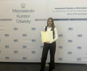 Delegacja naszej szkoły: dyrektor – Marta Bińkowska oraz przedstawiciel uczniów – Jakub Ziętek, wzięła udział w gali wręczenia honorowych wyróżnień „Szkoła czułości bez obojętności” Mazowieckiej Kurator Oświaty. Uroczystość odbyła się w Mazowieckim Urzędzie Wojewódzkim w Warszawie.