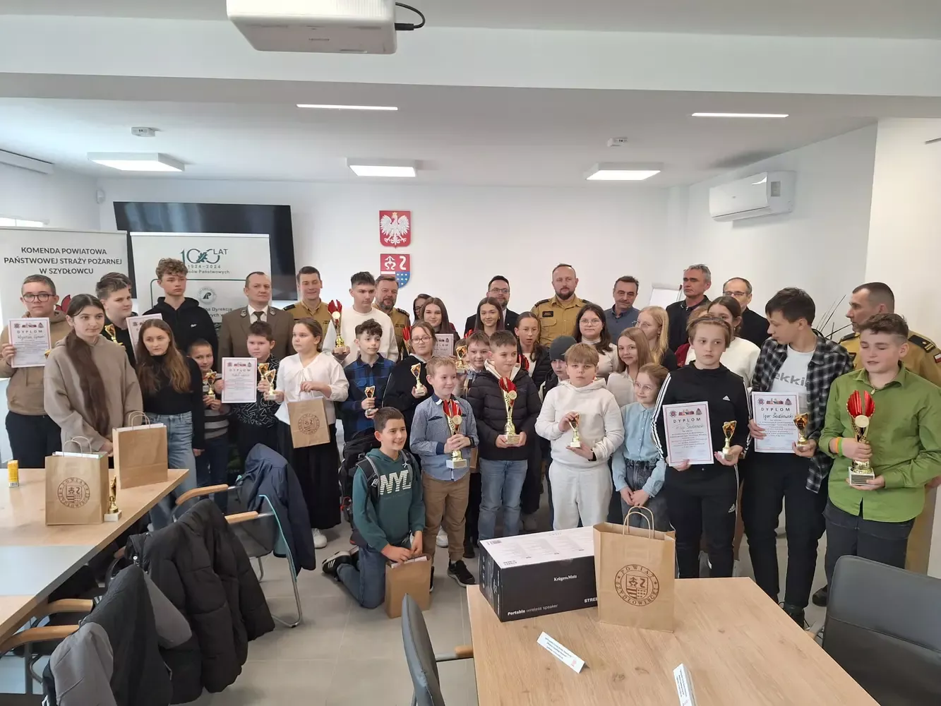 W oczekiwaniu na wyniki, dzięki uprzejmości Komendy Powiatowej Państwowej Straży Pożarnej w Szydłowcu, uczestnicy konkursu mieli okazję wziąć udział w prezentacji profesjonalnego sprzętu strażackiego. Zwycięzcy oraz uczestnicy otrzymali nagrody i upominki, które wręczyli: