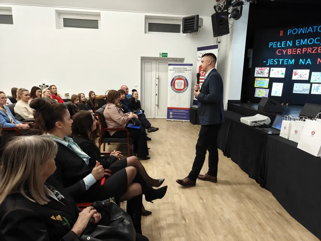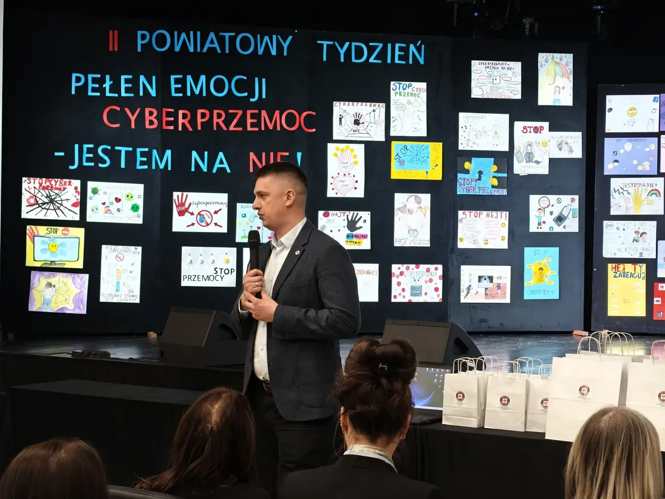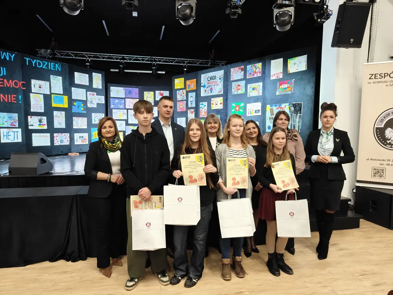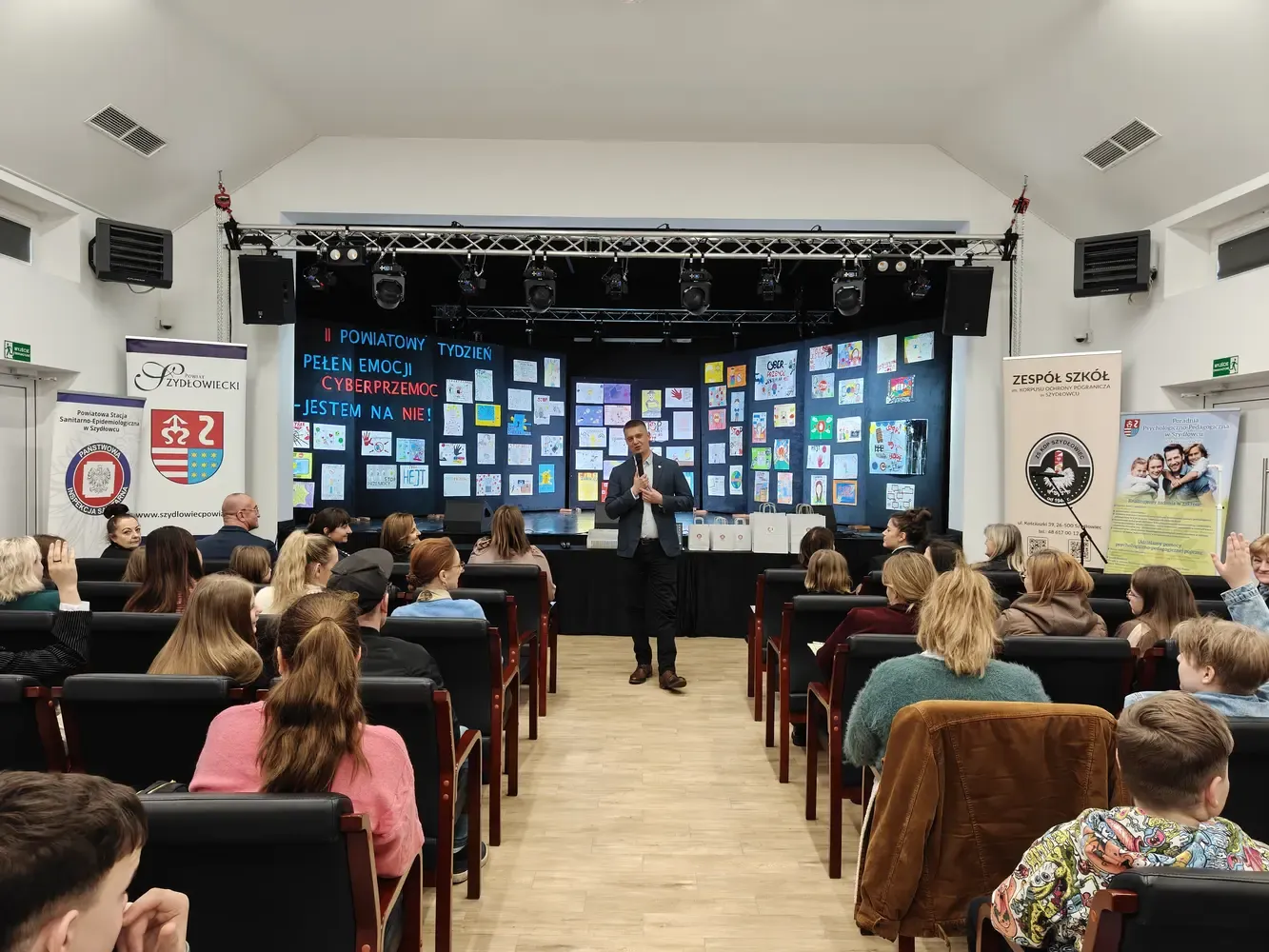 Pierwsza część wydarzenia miała charakter profilaktyczno-edukacyjny i była skierowana do uczniów szkół podstawowych z terenu powiatu szydłowieckiego. Odbyło się wręczenie nagród w konkursie Galeria Kreatywności – Cyberprzemoc: jestem na NIE!. W konkursie wzięło udział ponad 100 uczniów, którzy poprzez swoje prace pokazali, że nie ma ich zgody na hejt, przemoc i krzywdzenie innych w sieci. Serdecznie gratulujemy wszystkim laureatom oraz uczestnikom. Kolejnym punktem programu była pogadanka prowadzona przez mł. asp. Kamila Wardę z Centralnego Biura Zwalczania Cyberprzestępczości – Zarząd w Radomiu. Prelegent w przystępny, a jednocześnie bardzo konkretny sposób przybliżył uczniom zagrożenia płynące z cyberprzemocy, uświadomił konsekwencje nieodpowiedzialnych zachowań w internecie oraz wskazał, jak reagować i gdzie szukać pomocy.