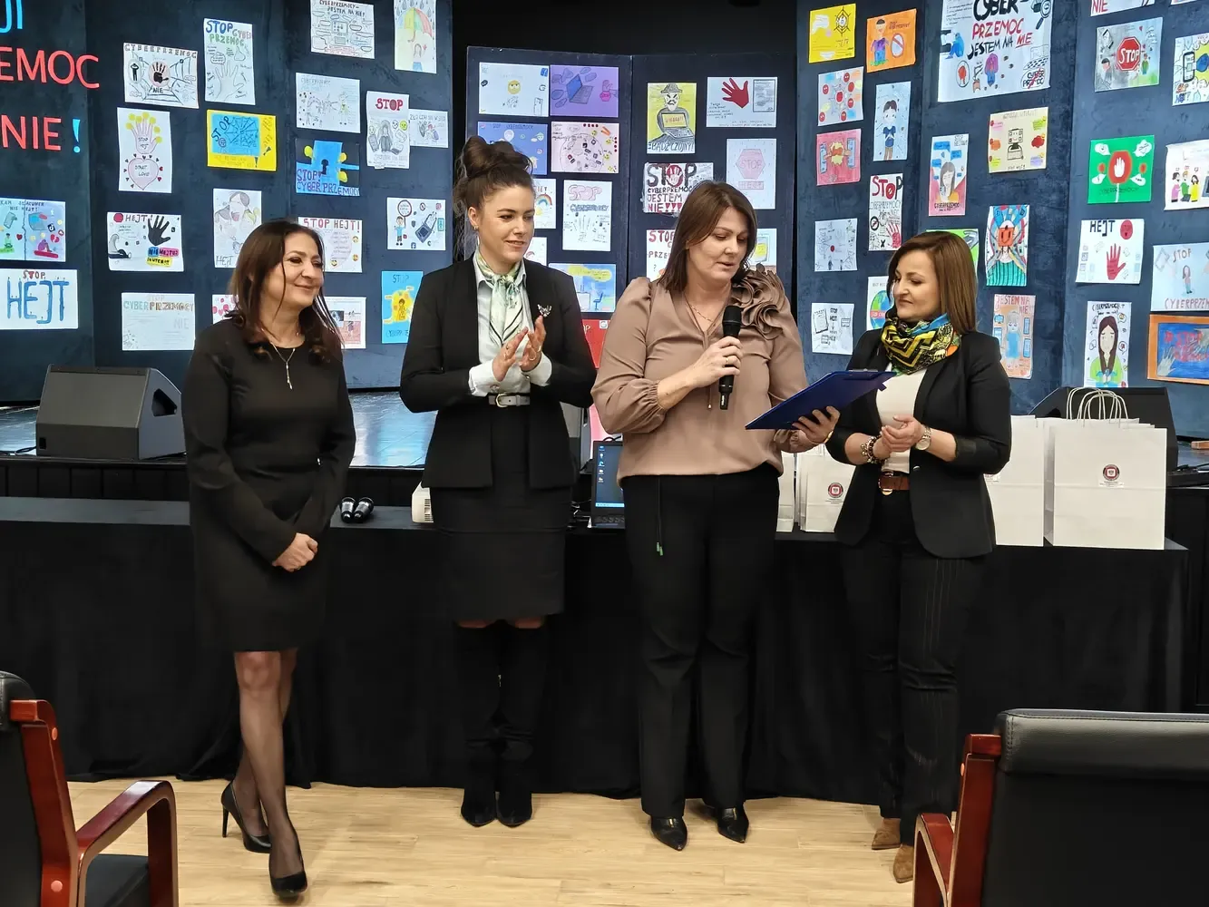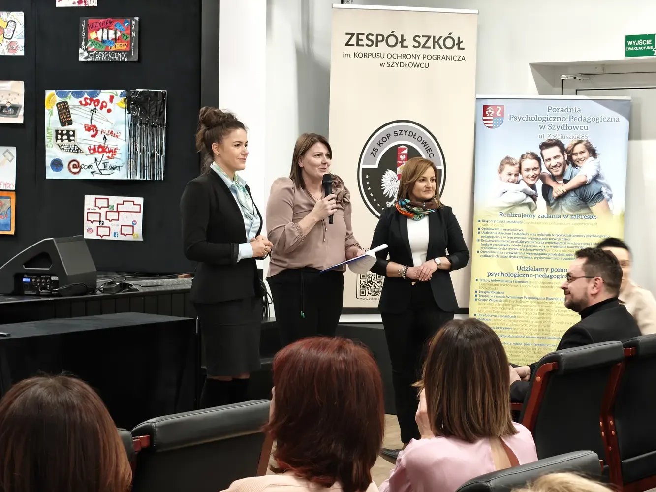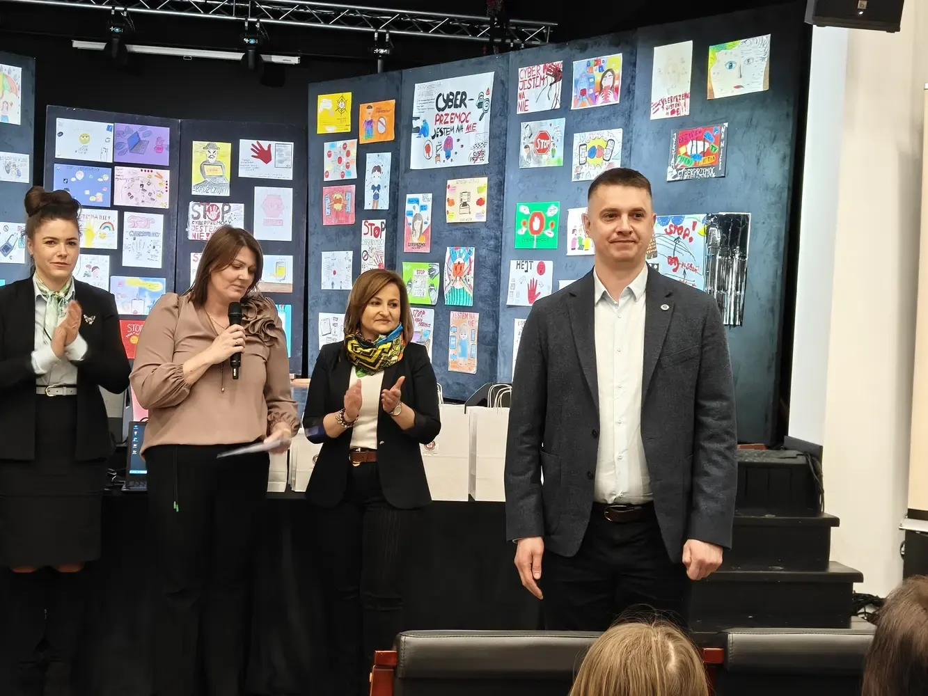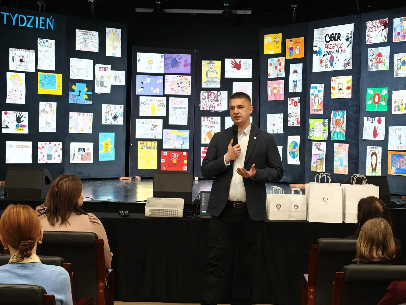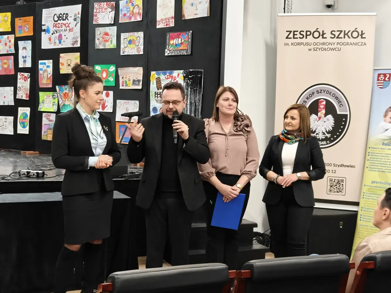 Pierwsza część wydarzenia miała charakter profilaktyczno-edukacyjny i była skierowana do uczniów szkół podstawowych z terenu powiatu szydłowieckiego. Odbyło się wręczenie nagród w konkursie Galeria Kreatywności – Cyberprzemoc: jestem na NIE!. W konkursie wzięło udział ponad 100 uczniów, którzy poprzez swoje prace pokazali, że nie ma ich zgody na hejt, przemoc i krzywdzenie innych w sieci. Serdecznie gratulujemy wszystkim laureatom oraz uczestnikom. Kolejnym punktem programu była pogadanka prowadzona przez mł. asp. Kamila Wardę z Centralnego Biura Zwalczania Cyberprzestępczości – Zarząd w Radomiu. Prelegent w przystępny, a jednocześnie bardzo konkretny sposób przybliżył uczniom zagrożenia płynące z cyberprzemocy, uświadomił konsekwencje nieodpowiedzialnych zachowań w internecie oraz wskazał, jak reagować i gdzie szukać pomocy.