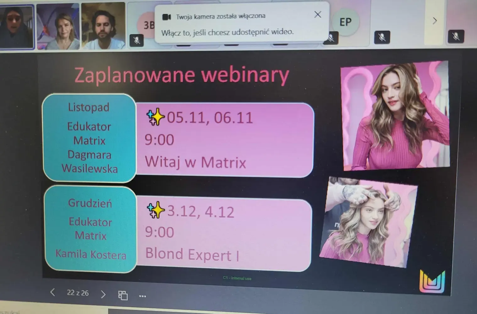 Z radością informujemy, że nasza szkoła przystąpiła do ogólnopolskiego projektu edukacyjnego Matrix Pro Academy. W ramach współpracy uczniowie technikum – kierunek technik usług fryzjerskich oraz branżowej szkoły I stopnia – zawód fryzjer w dniu dzisiejszym wzięli udział w pierwszym szkoleniu na żywo w formie online