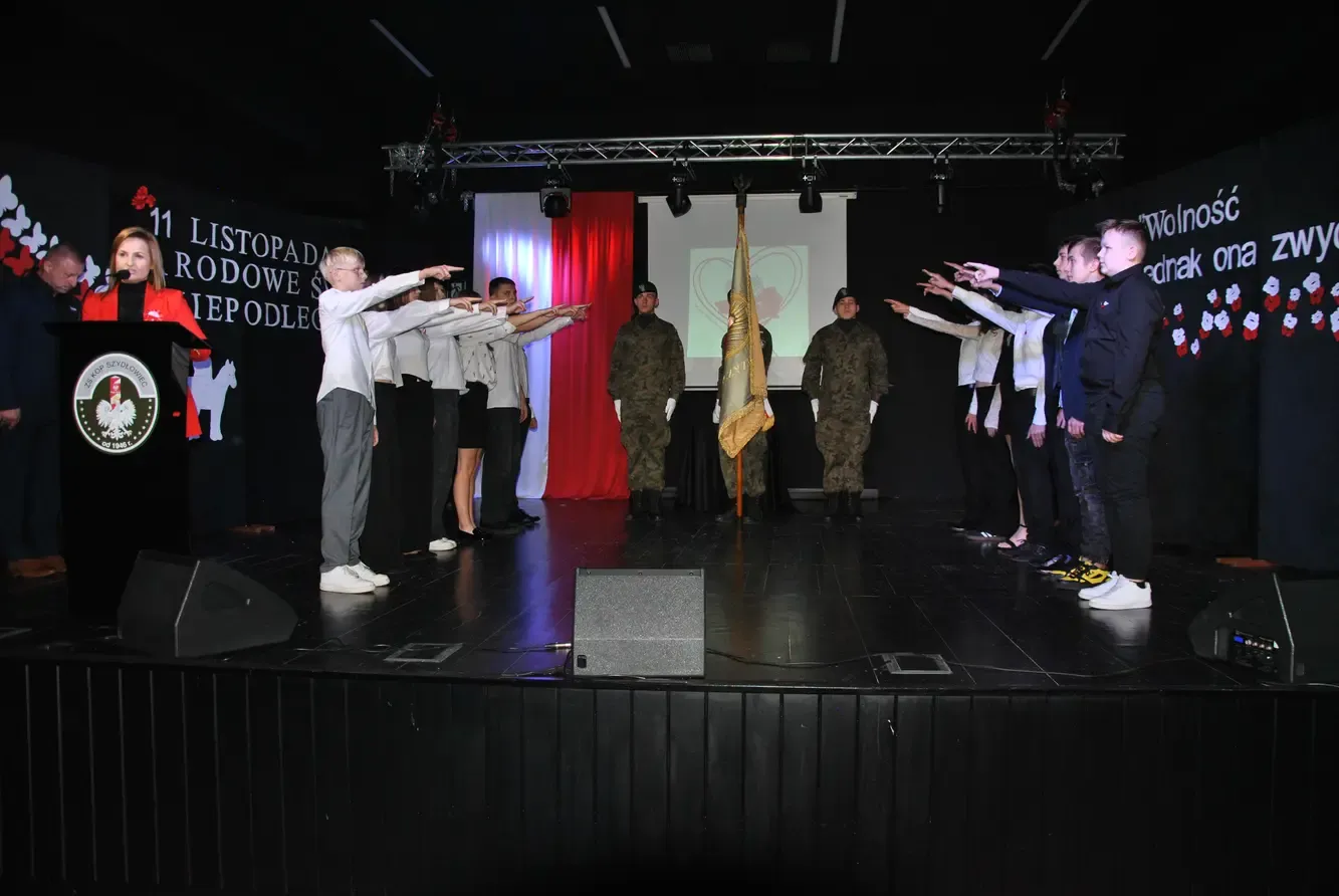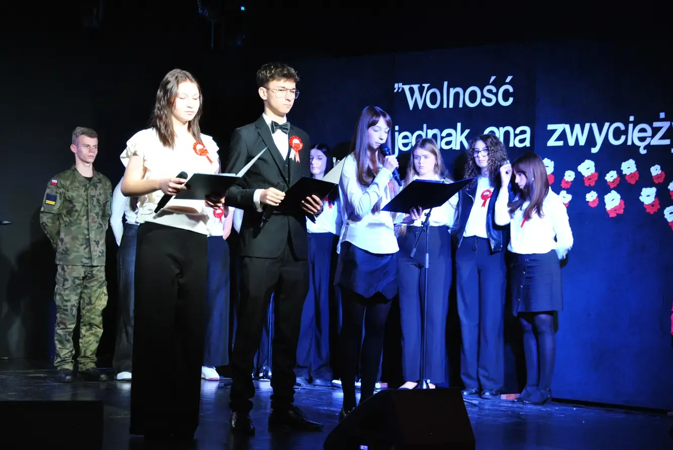 W dniu 13 listopada br. w sali widowiskowej naszej szkoły odbyło się uroczyste ślubowanie klas pierwszych, które zostało połączone z obchodami Narodowego Święta Niepodległości. Młodzież ze starszych klas przygotowała dla swoich młodszych kolegów wzruszającą i podniosłą uroczystość, która podkreśliła wagę tego wyjątkowego wydarzenia. Hasłem przewodnim tegorocznych obchodów były słowa Cypriana Kamila Norwida: „Wolność – jednak ona zwycięży”. Cytat ten stał się inspiracją dla scenariusza uroczystości, przypominając, że wolność jest wartością, o którą należy dbać każdego dnia, zarówno w życiu osobistym, jak i społecznym.