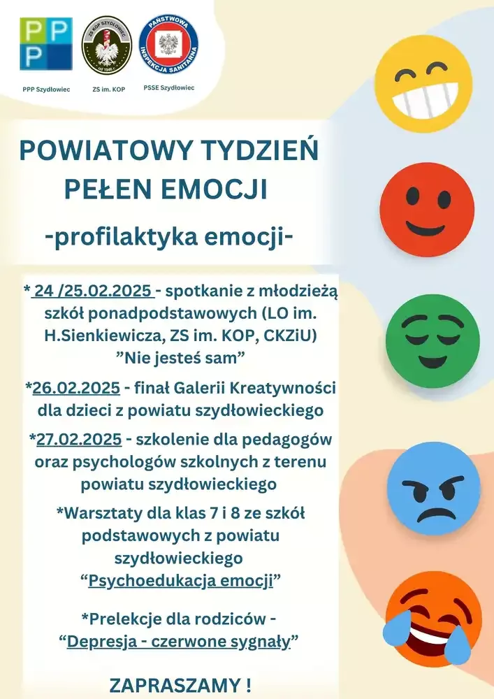 Nasza szkoła wspólnie z Poradnią Psychologiczno-Pedagogiczną w Szydłowcu oraz Powiatową Stacją Sanitarno-Epidemiologiczną w Szydłowcu zaprasza do udziału w Powiatowym Tygodniu Pełnym Emocji – wyjątkowym projekcie edukacyjno-profilaktycznym, który odbędzie się w lutym 2025 roku.