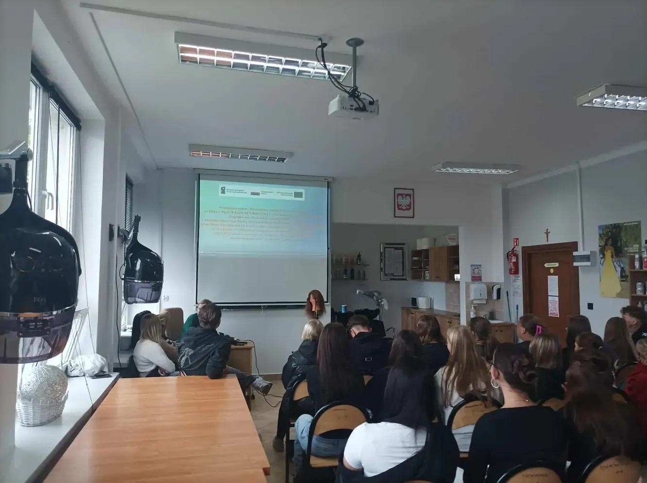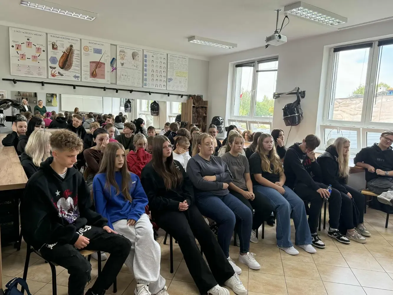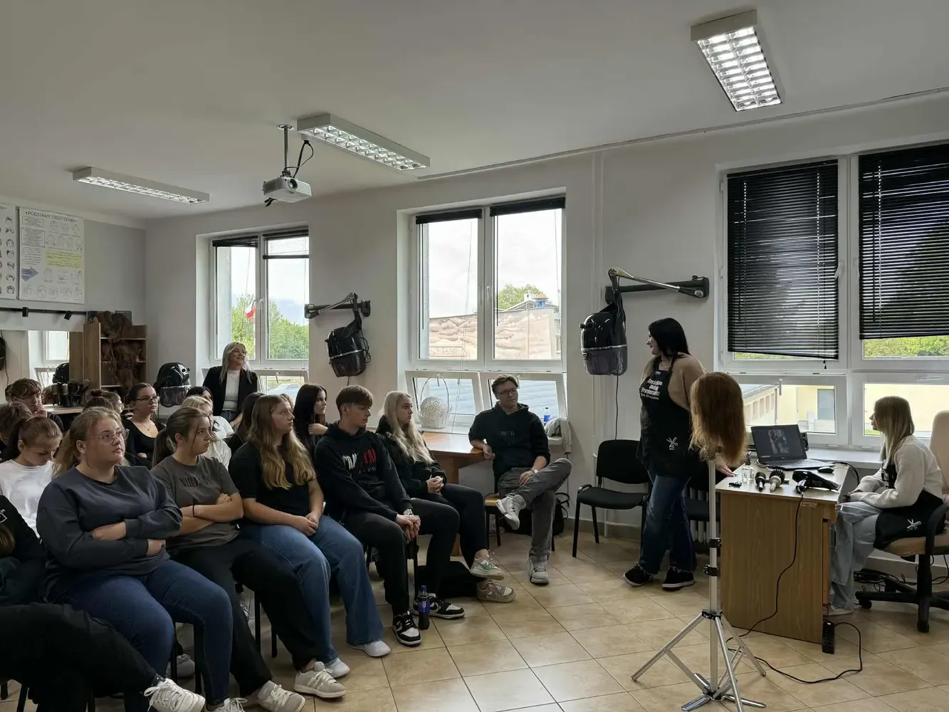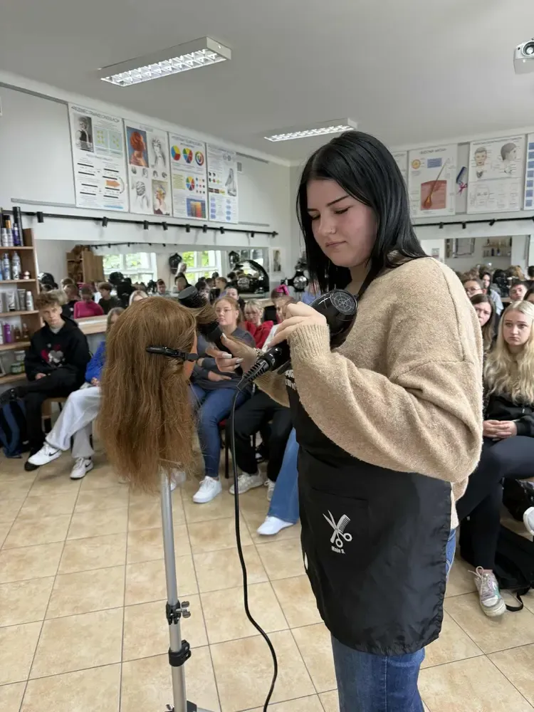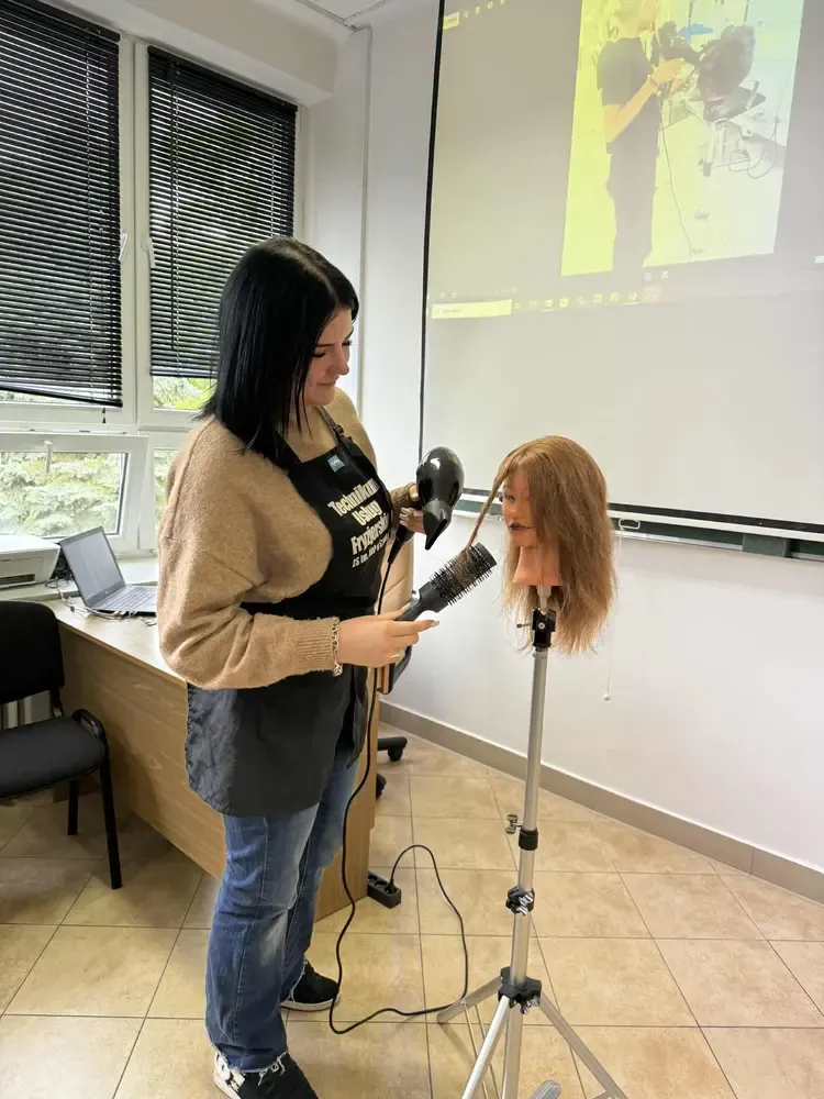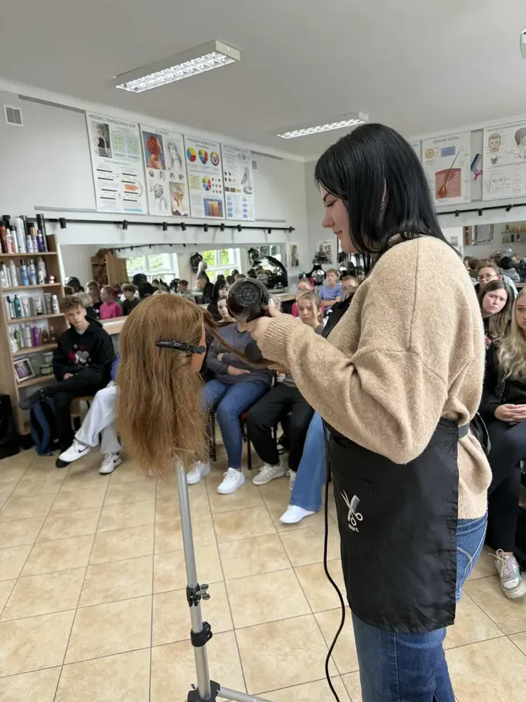 W dniu 24.09.2025r. odbyło się wyjątkowe spotkanie uczniów Technikum Usług Fryzjerskich z przedstawicielami innych klas naszej szkoły. Celem wydarzenia było podzielenie się wrażeniami i doświadczeniami zdobytymi podczas praktyk zawodowych, które miały miejsce w Portugalii w ramach przedsięwzięcia „Rozwijamy kompetencje zawodowe” nr 2024-1-PL01-KA122-VET-000233011. Projekt jest finansowany w ramach projektu Funduszu Europejskiego dla Rozwoju Społecznego (FERS) „Zagraniczna mobilność edukacyjna uczniów i absolwentów oraz kadry kształcenia zawodowego” realizowanego przez Fundację Rozwoju Systemu Edukacji na zasadach Programu Erasmus+ sektor Kształcenie i Szkolenia Zawodowe. Kwota dofinansowania wynosi 281895,91 zł.