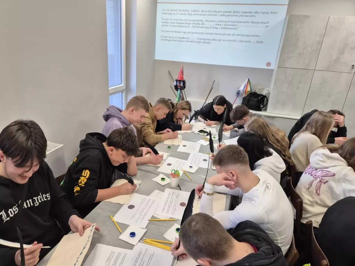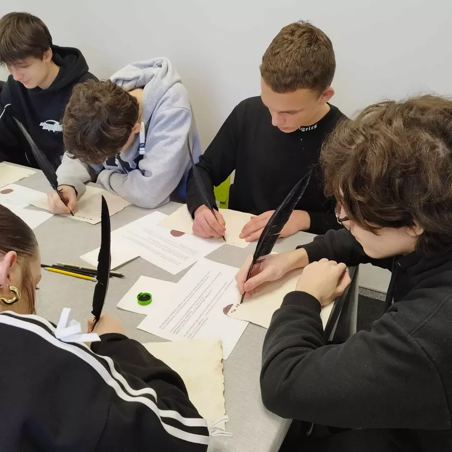 Potem wzięliśmy udział w warsztatach „Wśród dawnych ksiąg i dokumentów”. Brzmi poważnie? Może trochę, ale wcale nie było nudno! Wzięliśmy udział w warsztatach na których dowiedzieliśmy się o początkach pisma, a potem sami mieliśmy okazję coś napisać dawnym sposobem – gęsim piórem – niezłe wyzwanie, ale całkiem ciekawe.